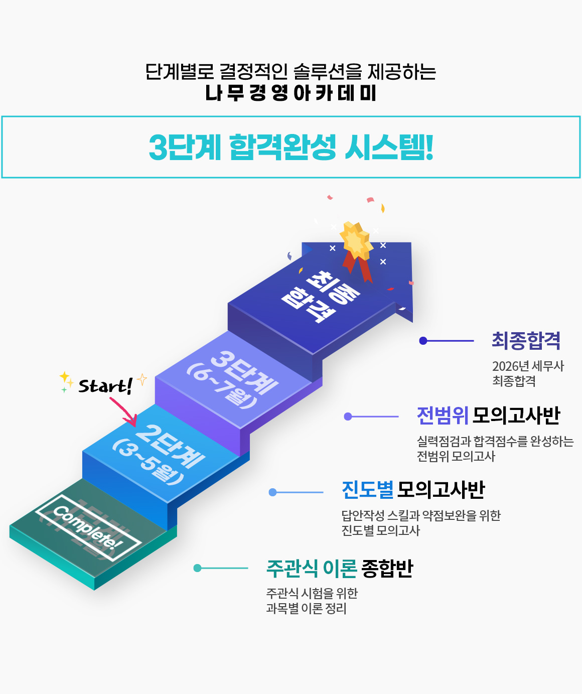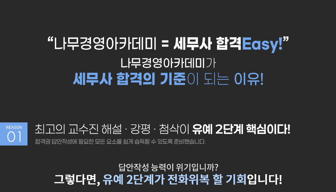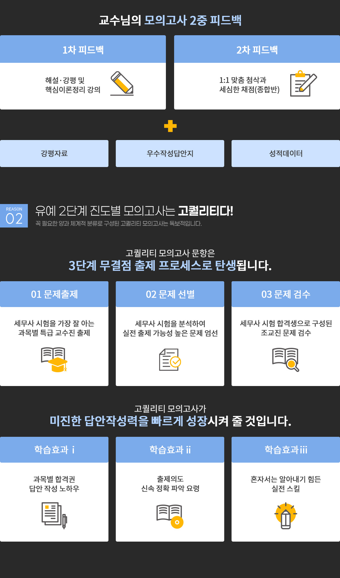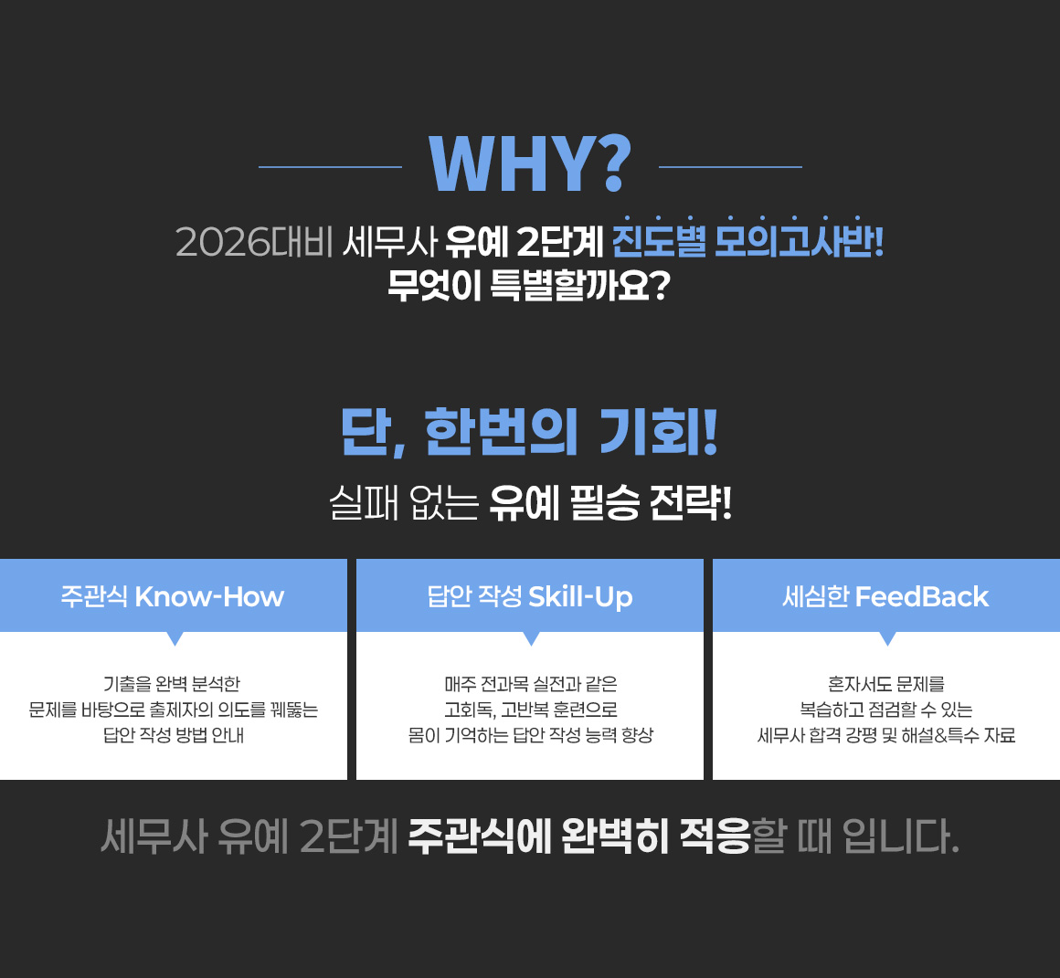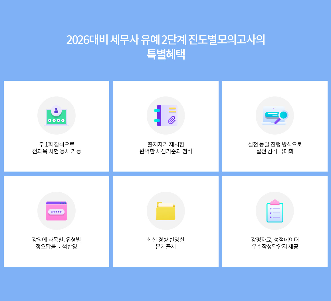 2026년 세무사 2차 시험 합격을 목표로 실제시험과 동일한 방식으로 진도별 모의고사를 실시하고, 시험 직후 진행되는 해설강의와 전문 채점단의 답안지 채점 및 첨삭을 통해 빠른 피드백이 가능하므로, 세무사 2차 시험에 대한 심화학습이 가능함.